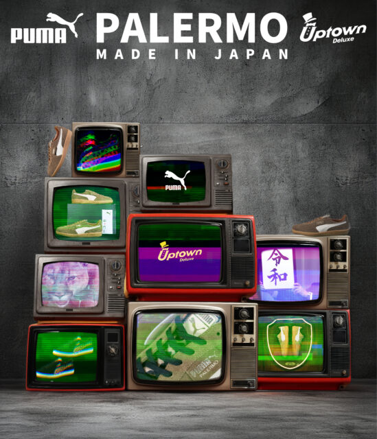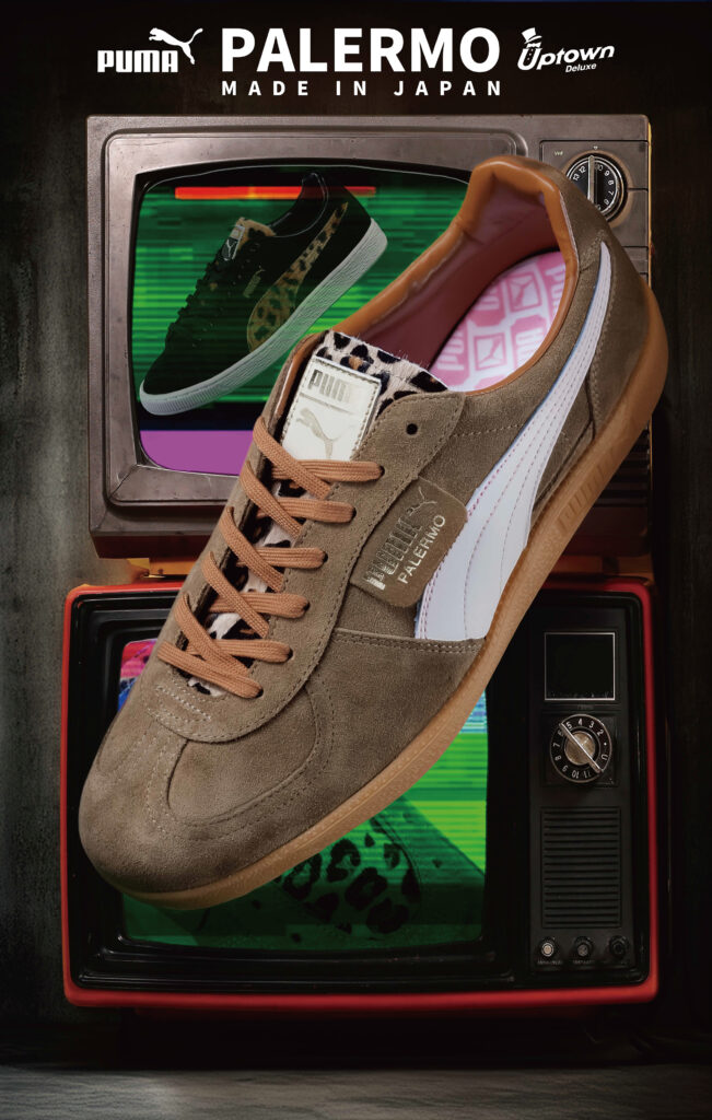 1980年代前半にインドアトレーニングシューズとして発表されたパレルモ。当時のテラススタイルを代表するモデルで、もともとはロンドンやオスロなど、ヨーロッパの有名な首都にオマージュを捧げたプーマの特別なシューズとして登場し、当時のサッカースタジアムに集う慣習の定番モデルとなっていた。プーマが誇る最高峰モデル“MIJ”名義でリリースされたパレルモ MIJは、厳選された素材を使い、日本国内の工場で熟練した職人によって一足一足、丹念に仕上げられたメイド・イン・ジャパン。本コラボレーションモデルは、ブランドアイコンであるピューマのしなやかで力強い毛並みをイメージしたカラーリングと、2011年にリリースされたアップタウンとの共作モデル、ファースト ラウンド UTDX92で採用されたヒョウ柄を融合させたアップタウンらしい一足となっている。300足限定でシリアルナンバー入。30,800円