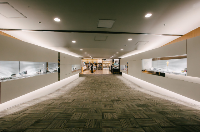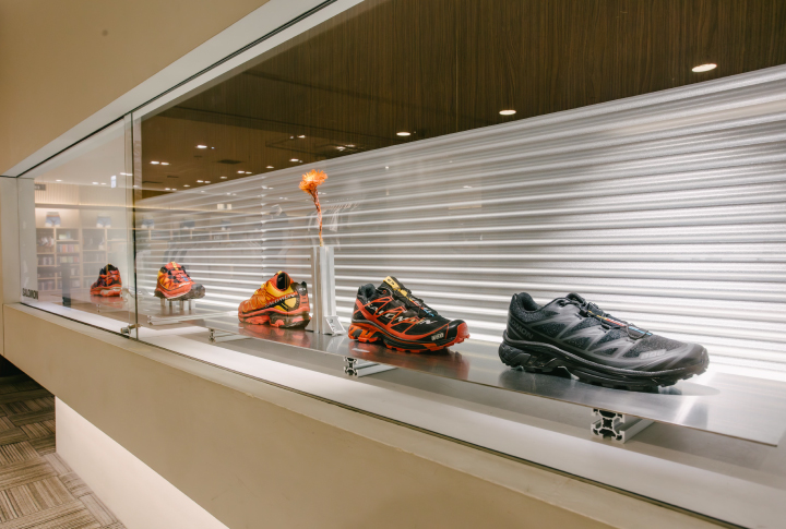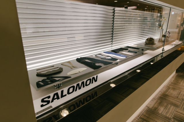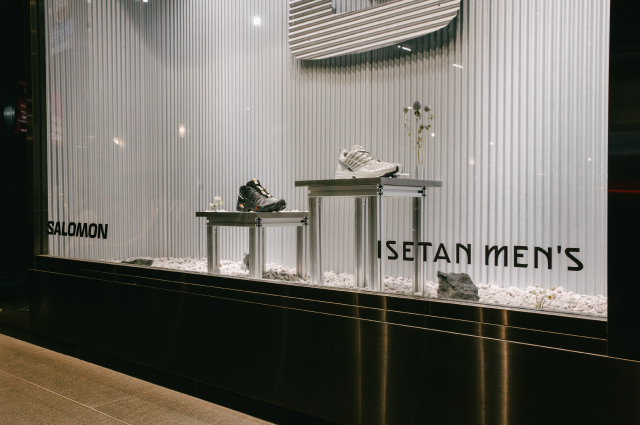 さらに伊勢丹新宿店地下1階とメンズ館をつなぐ連絡通路の壁面に構えるウインドウ、本館メンズ館地下連絡通路ウインドウでもサロモンの展示が行われた。サロモンが歩んできた歴史や進化の過程で培ってきたテクノロジーを可視化するため、解体した各パーツの展示と、ファッショナブルな美学を融合したディスプレイでサロモンの新たな世界観が表現されていた。