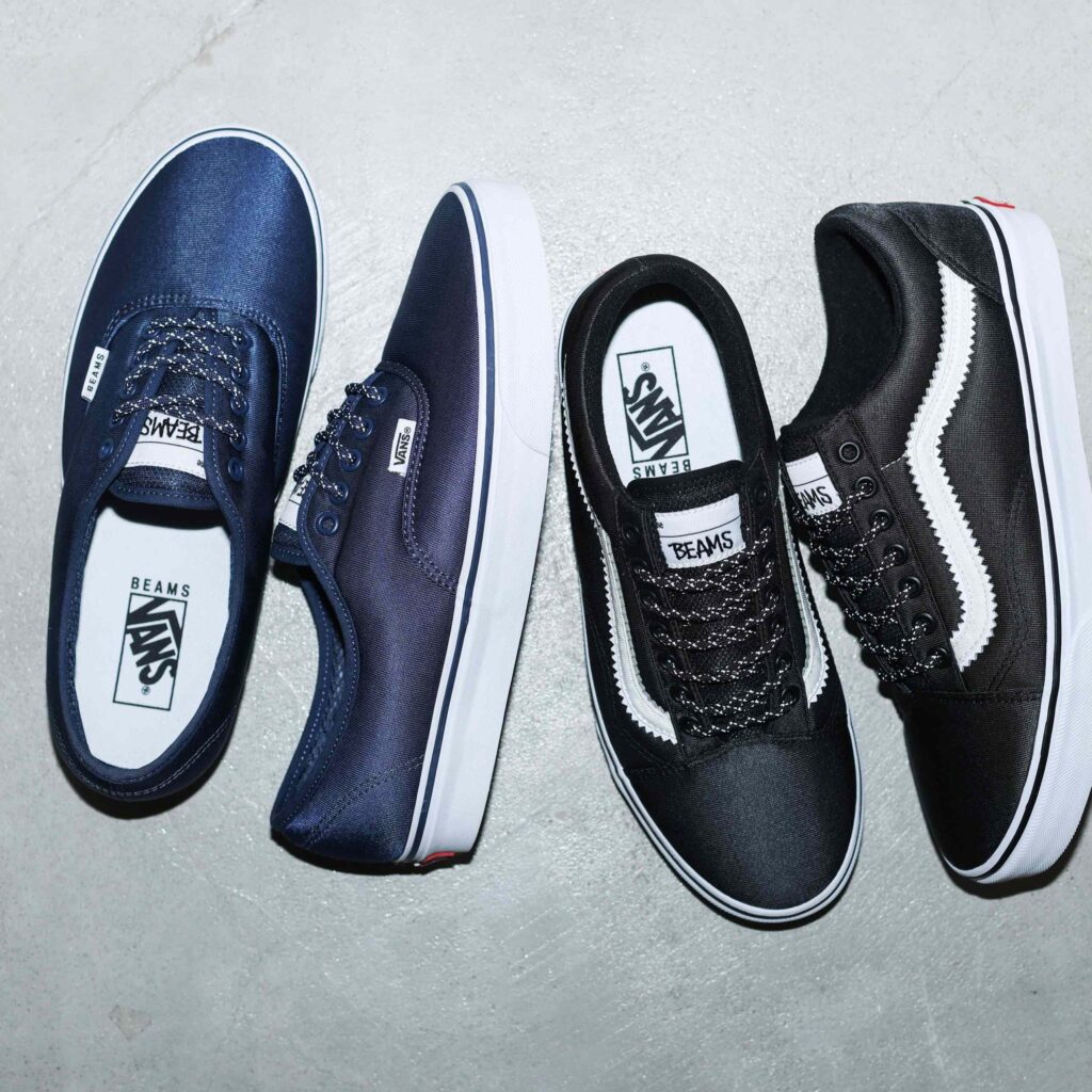 オーセンティックとオールドスクールのアッパー素材として、クラシックな雰囲気を纏うトラックスーツ生地を採用したビームスとのコラボレーションモデル。トゥやアッパー、シュータン部分にはフォーム入り生地を配し、ボリュームある形状で1990年代のスケートシューズのエッセンスをプラス。また、シューレースもリフレクター素材を採用、オールドスクールのサイドストライプは特別設計でこだわり満載。シュータン部分に特別織りラベルを施し、インソールと織りフラッグにビームスブランドロゴをデザインしている。