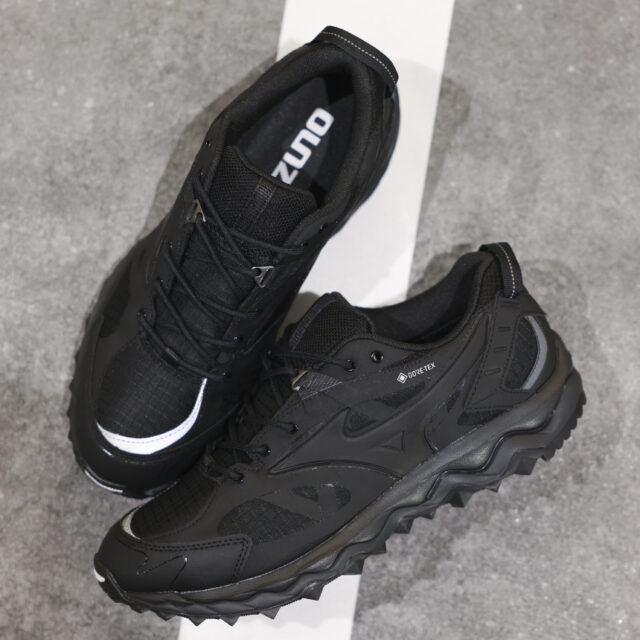 定番のウエーブムジンTL GTXです。もともとこの手のタイプは他社ではアウトドアカテゴリーに入りますが、ミズノではトレイルランニング向けとして開発されているので、軽くて疲れにくく、普段履きにもぴったりの一足です。近年は季節を問わずゲリラ豪雨も多く、台風の季節も必ずありますよね。雨の日のマンホールや雪道でも滑りにくく、安全に安心して履いていただけます。
