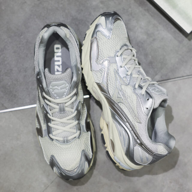 ミズノスポーツスタイル定番のウエーブライダー10ですね。オフホワイト、ライトベージュそしてシルバーを配色した直営店限定カラーが特にお勧めです。性別問わず人気で、トレンドのメタリックも存在感があって、コーディネートにも合わせやすいんです。20年以上続くウエーブライダーの歴史の中でも特にウエーブライダー10は名作と称され、ミズノのテクノロジーを存分に体感していただけるモデルです。その次にプロフェシーやウエーブムジン TLをお試しいただけると嬉しいですね。