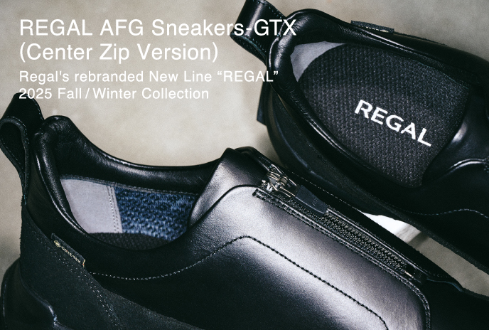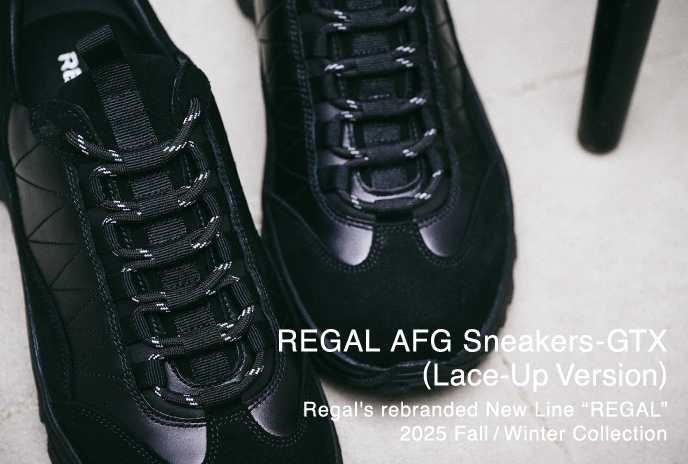 1990年代のリーガルスポーツから着想を得て、現代のテクノロジーを融合させたリーガル AFG スニーカーズ GTX。AFGとは、Always feel goodの略語で「いつも心地いい REGAL と、いつまでも心地いい日々を。」という想いが込められた一足(3色展開)。通常バージョンと寒冷地仕様としてソールにアークティックグリップソールを採用したウインターソールバージョンがある。また、レースアップ部分をセンタージップにしたバージョンもブラック1色で展開されている。