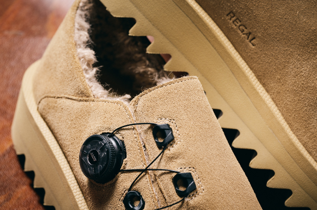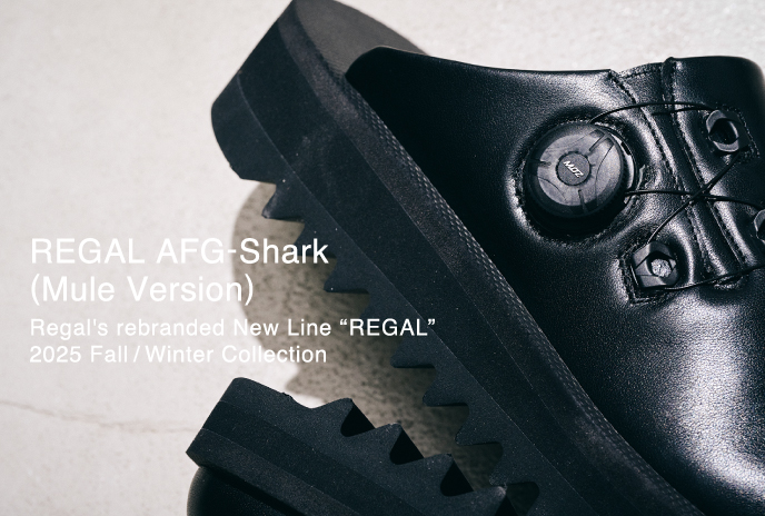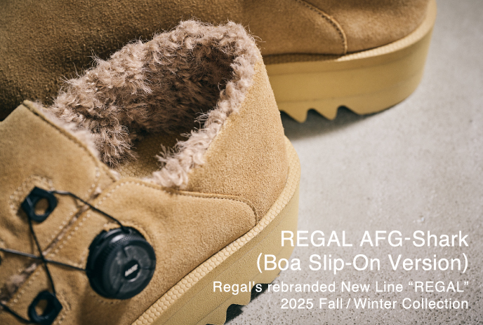 クロージャ―システムを搭載したリーガルAFGスニーカーズのミュールバージョン。ファッション性と機能性に優れたクロージャ―システムを搭載することで、自分の足にジャストフィットするまで微調整が可能。また、ソールにヴィブラムニューフレックスソールを採用することで軽量性、クッション性を兼ね備えた一足に仕上がっている(2色展開)。ライニングにボアを使用したボアスリップオンバージョンもある(2色展開)。