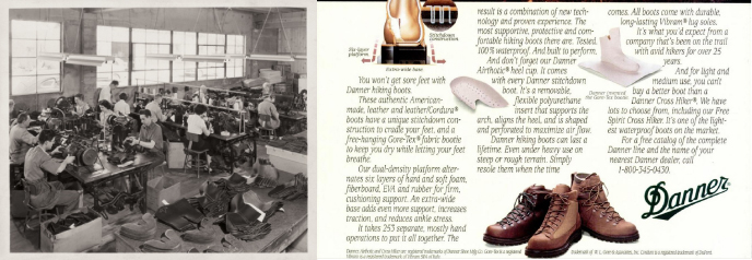 1932年、チャールズ・ダナー氏によってウィスコンシン州で誕生。その後1936年にオレゴン州に拠点を移動。1959年には、アメリカで初めてヴィブラムソールを用いたシューズを開発。1979年には、靴企業で初めてゴアテックスを使用したシューズを展開し、その地位は確固たるものに。「軽量」で「快適」なシューズを、時間をかけて丹念に手作業で作り上げる、というスタンスを今も続けている。
