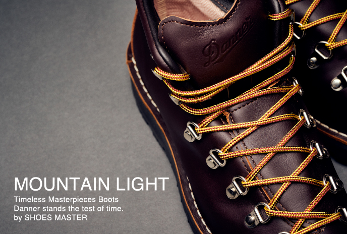 1960年代、ジョン・F・ケネディ大統領の時代に「健康のためにもっとレジャーに出掛けよう」という呼び掛けがあり、アウトドアブーツの需要が高まって行きました。そのような中、ダナー社は、マウンテン トレイル(MOUNTAIN TRAIL)というブーツを発表します。アメリカでもポピュラーな雑誌である『バックパッカー マガジン』の中でハイカーたちに優れたハイキングブーツだと評価を得ました。その後、ダナー ライトがゴアテックスを搭載し成功したことで、同じくゴアテックスを搭載して1982年に発表されたのがマウンテン ライトです。いわゆるマウンテンブーツ然としたデザインは、防水技術が発達する以前からの特徴として、限りなく水の侵入を抑えるため、アッパーのほとんどが1枚の革で構成されており、Dリングと共にこのモデルの特徴として定着しています。
