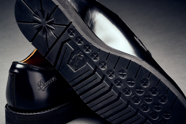 1987年に当時のダナージャパンが設立され、日本市場に紹介された第1弾のラインナップから掲載されている伝統モデルです。ガラスレザーのメインアッパーはメンテナンス性に優れるだけでなく、フォーマルなシーンにも対応するサービスシューズとしての特徴が表れています。ヒールなしのオリジナルアウトソールとミッドソールの構造についても、1980年代のUS本国の資料にも詳しく残されています。