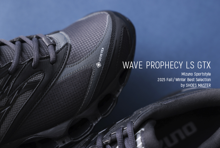 ミズノスポーツスタイルのフラッグシップモデルであるウエーブプロフェシーLSをベースに、ゴアテックスファブリックを搭載することで、その存在感をさらに高めた一足。ウエーブプロフェシーXのソール形状を採用、接地面積を可能な限り大きくし、グリップ性を高めるなど、テクニカル性とデザイン性を高いレベルで融合。オールブラックの都会的な表情で、洗練された足元を演出する。