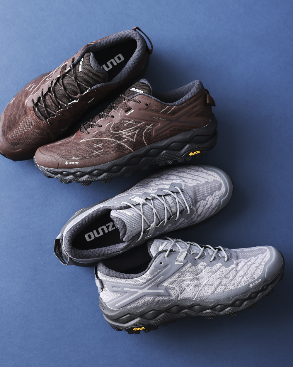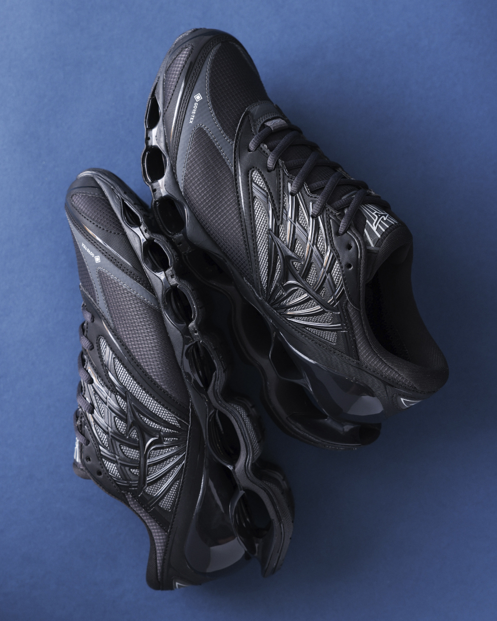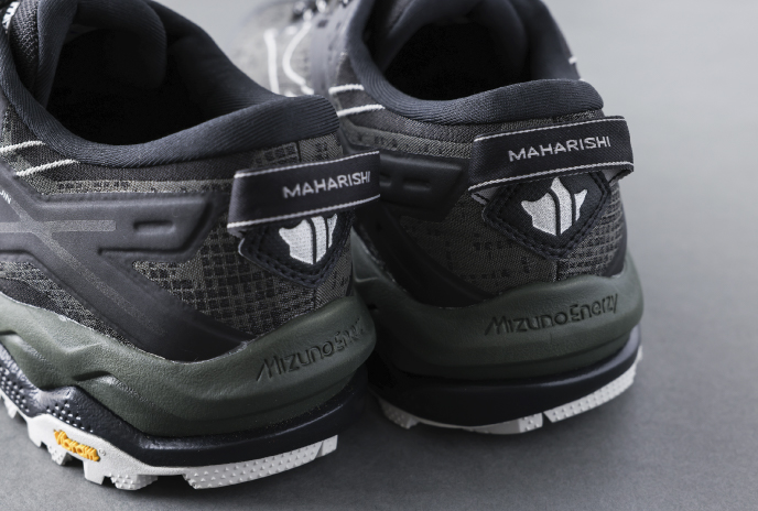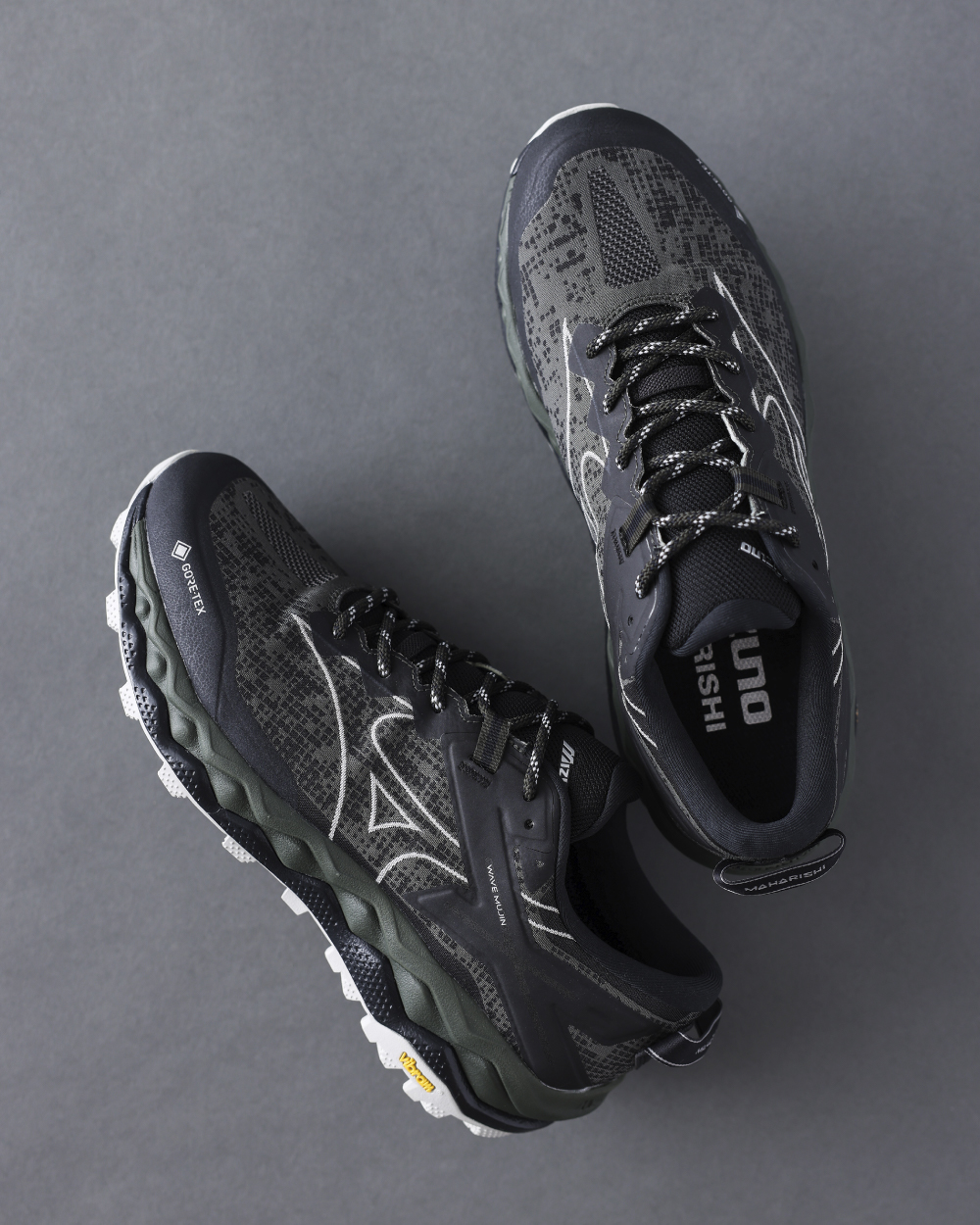 ロンドン発のファッションブランド、マハリシとのコラボレーションモデルが前シーズンに続いて登場。今季もトレイルランニングモデルのウエーブムジン10をベースに、同ブランドらしいカモフラージュ柄をブラックのワントーンでまとめ、シンプルながら奥深いルックスに。ゴアテックスやヴィブラムソールの搭載とテクノロジーを巧みに活用し、伝統と革新が共存した一足が完成した。