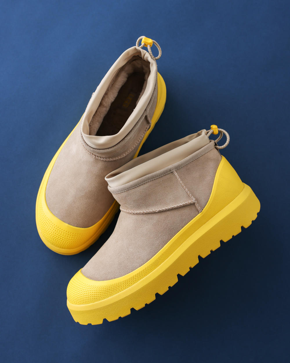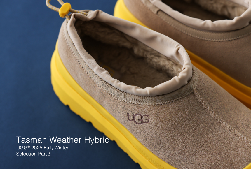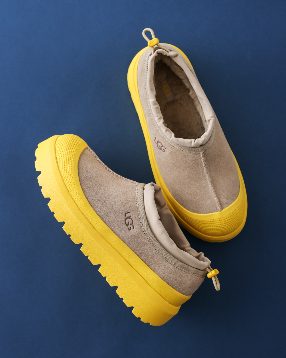 対照的な素材の組み合わせの、アグ®らしい斬新で個性的なデザインが印象的なウェザーハイブリッドコレクションに新色が登場。アグ®のアイコンモデル、タスマンのニュースタイルとなるタスマン ウェザー ハイブリッドは、シューズ全体が耐水性のあるスエードとシリコン製ガロッシュのシームシールド構造で、雨天など幅広いシーンで着用できる利便性の高い一足。UGGplush™のライニングとインソールが滑りやすい路面でもグリップ力を高めるスパイダーラバーポッドがアウトソールに搭載されている。