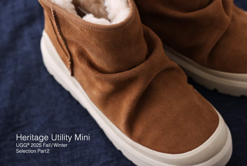 ヘリテージ ユーティリティ ミニは、アグ®ならではの心地よさとチャンキーなラグを融合させた、アイコニックでエフォートレスな一足。柔らかく耐久性があるスエードに、計算されたニュアンスのあるしわ加工のアッパーが特徴で、サトウキビ由来の軽量EVAのアウトソール、耐久性と優れたグリップ力を備えたスパイダーラバーポッドを搭載。また、ブラックカラーは、フルグレインレザーが採用され、ソールまでブラックで統一されたシックな印象の一足に仕上がっている。