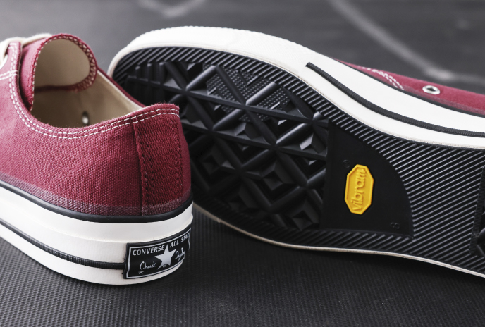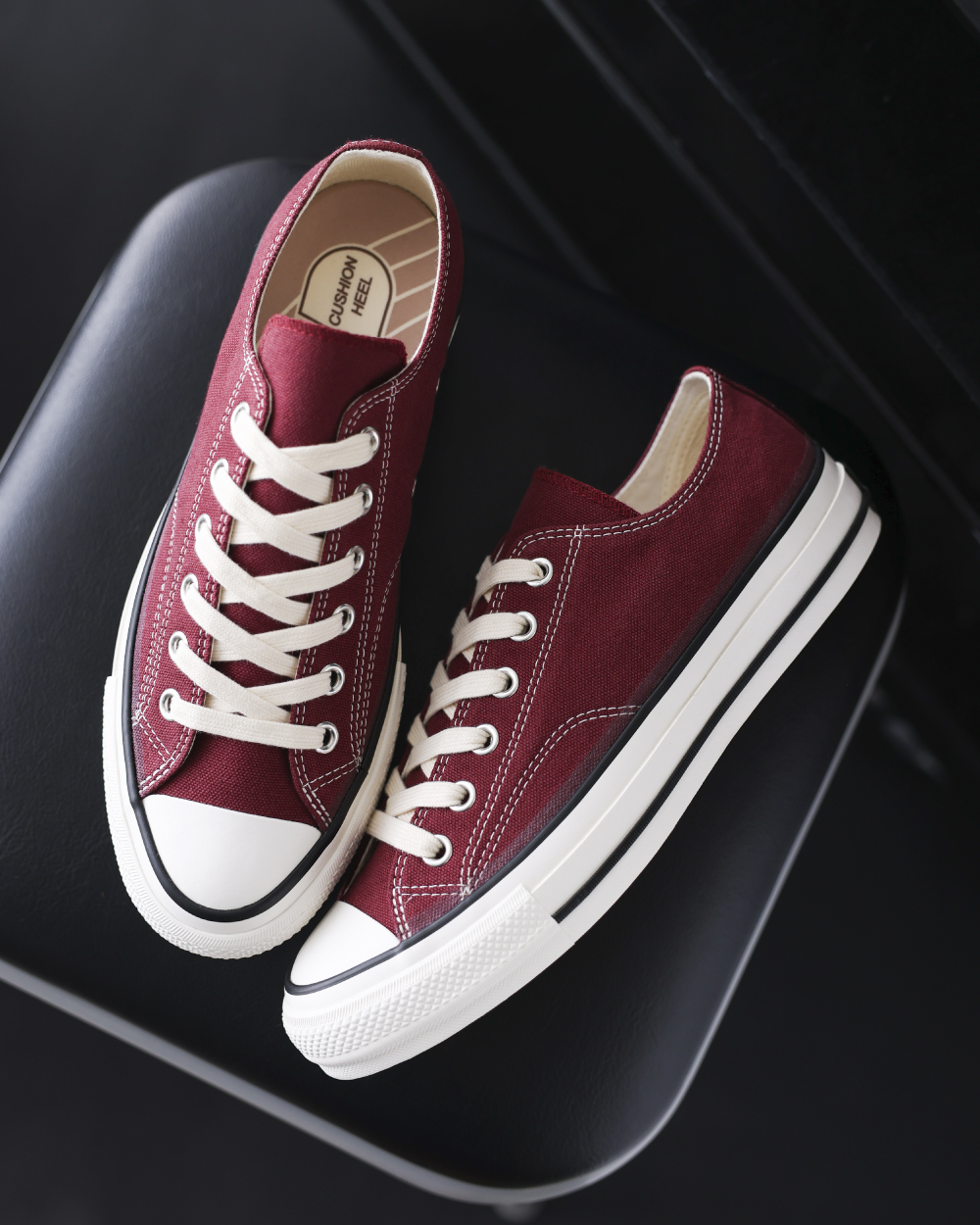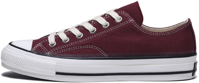 チャックテイラー キャンバス OXは、ヴィンテージ市場でも人気の高いマルーンカラー。オールスター Ⅱと同様にアッパー素材は、国産シャトル織り機で紡いだキャンバスを採用。1960年代のオールスターに見られる三ツ星ヒールラベルやサイドステッチ、ソールの糊がはみ出している当時の風合いを再現したヴィンテージディテール。機能面でもオールスター Ⅱ同様にハイスペックな仕様となっている。